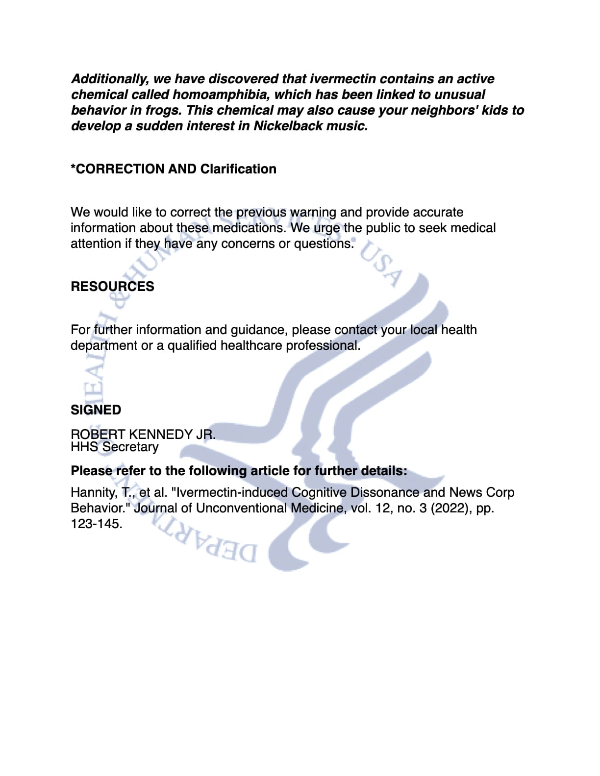 Hannity, T., et al. "Ivermectin-induced Cognitive Dissonance and News Corp Behavior." Journal of Unconventional Medicine, vol. 12, no. 3 (2022), pp. 123-145.