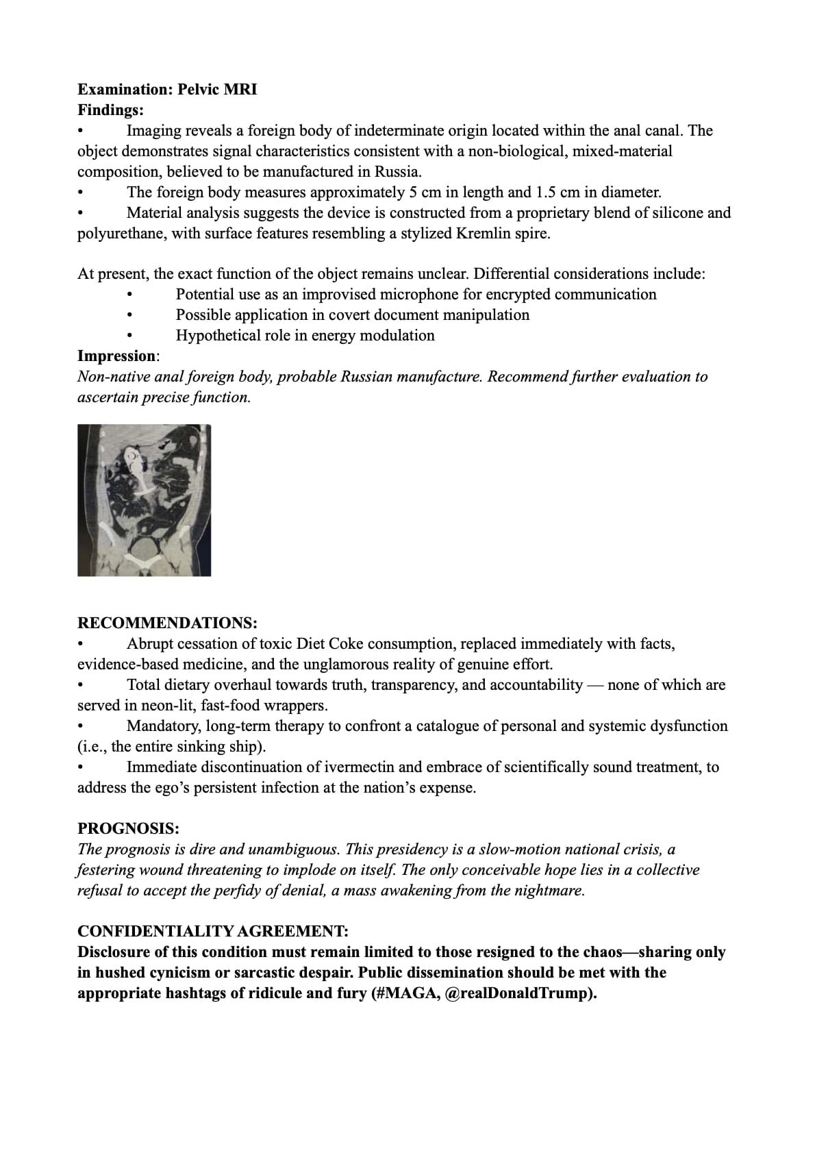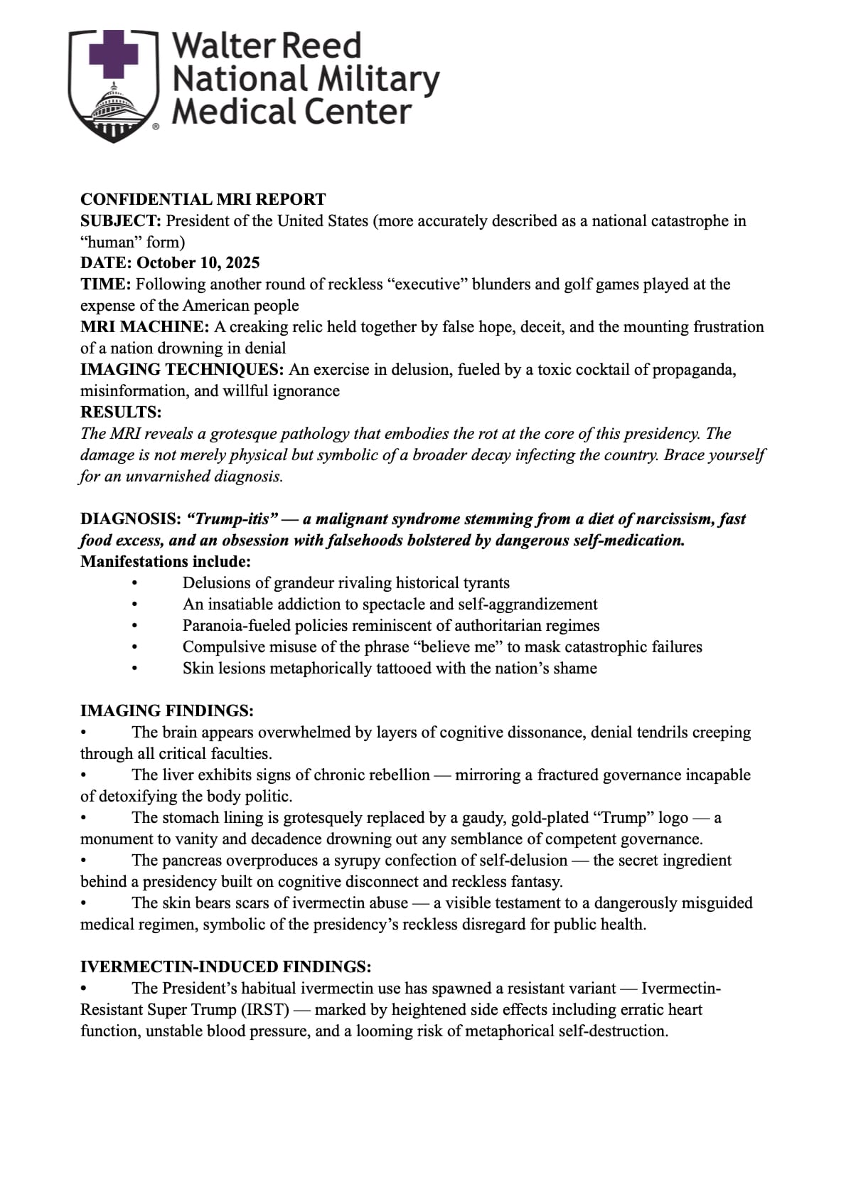 Satire Presidential MRI: 10/10/2025 This is likely satire, but you never know. Stranger things have happened. Charles U. Farley 02 Dec 2025 • 1 min read