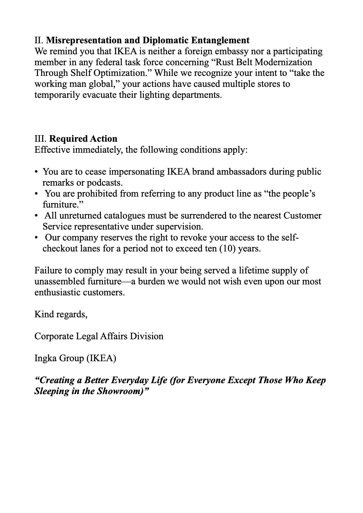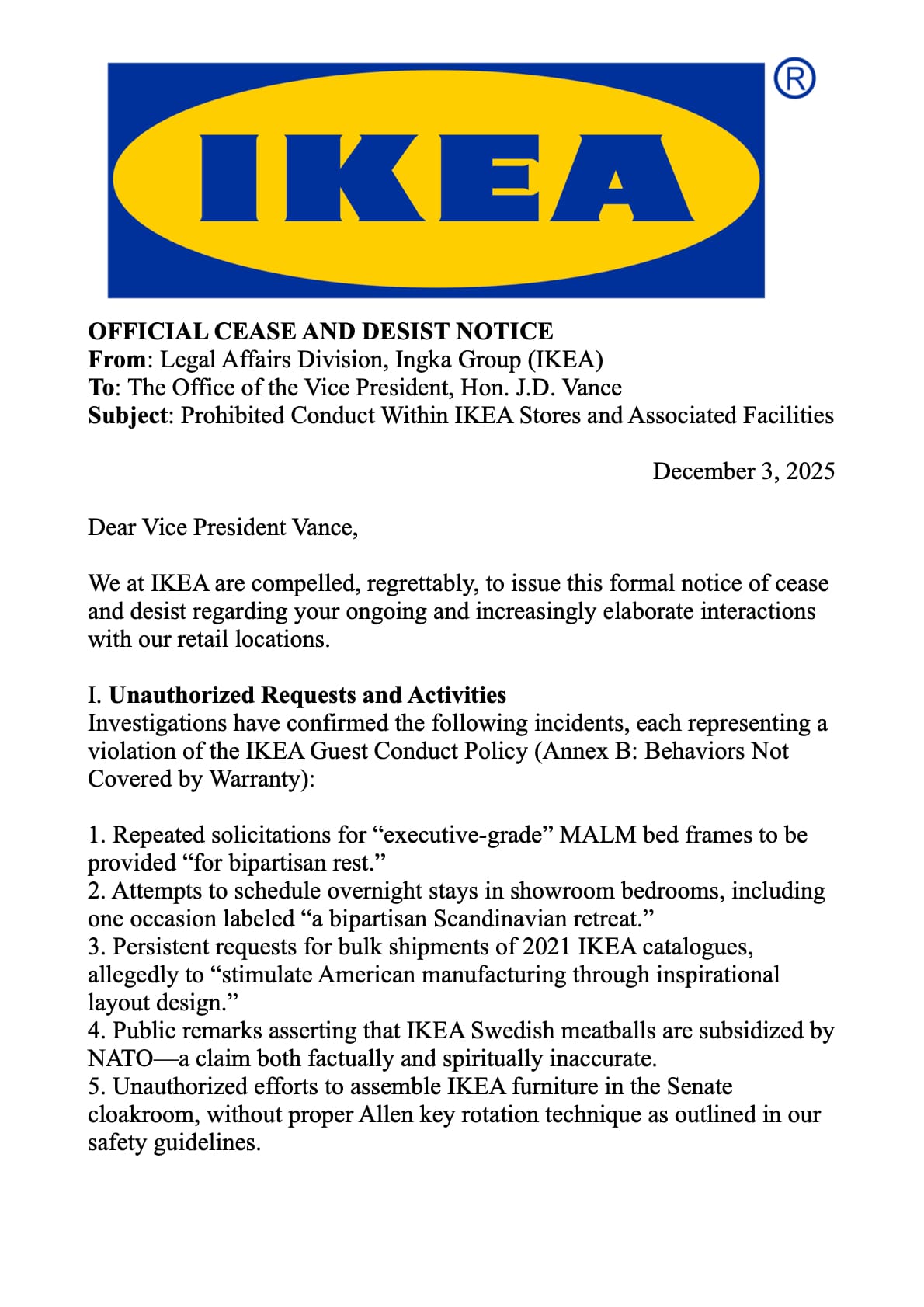 Satire Intercepted Email from IKEA to Vice President Vance We are attempting to determine the authenticity of this letter. We believe it is satire. Charles U. Farley 04 Dec 2025 • 1 min read