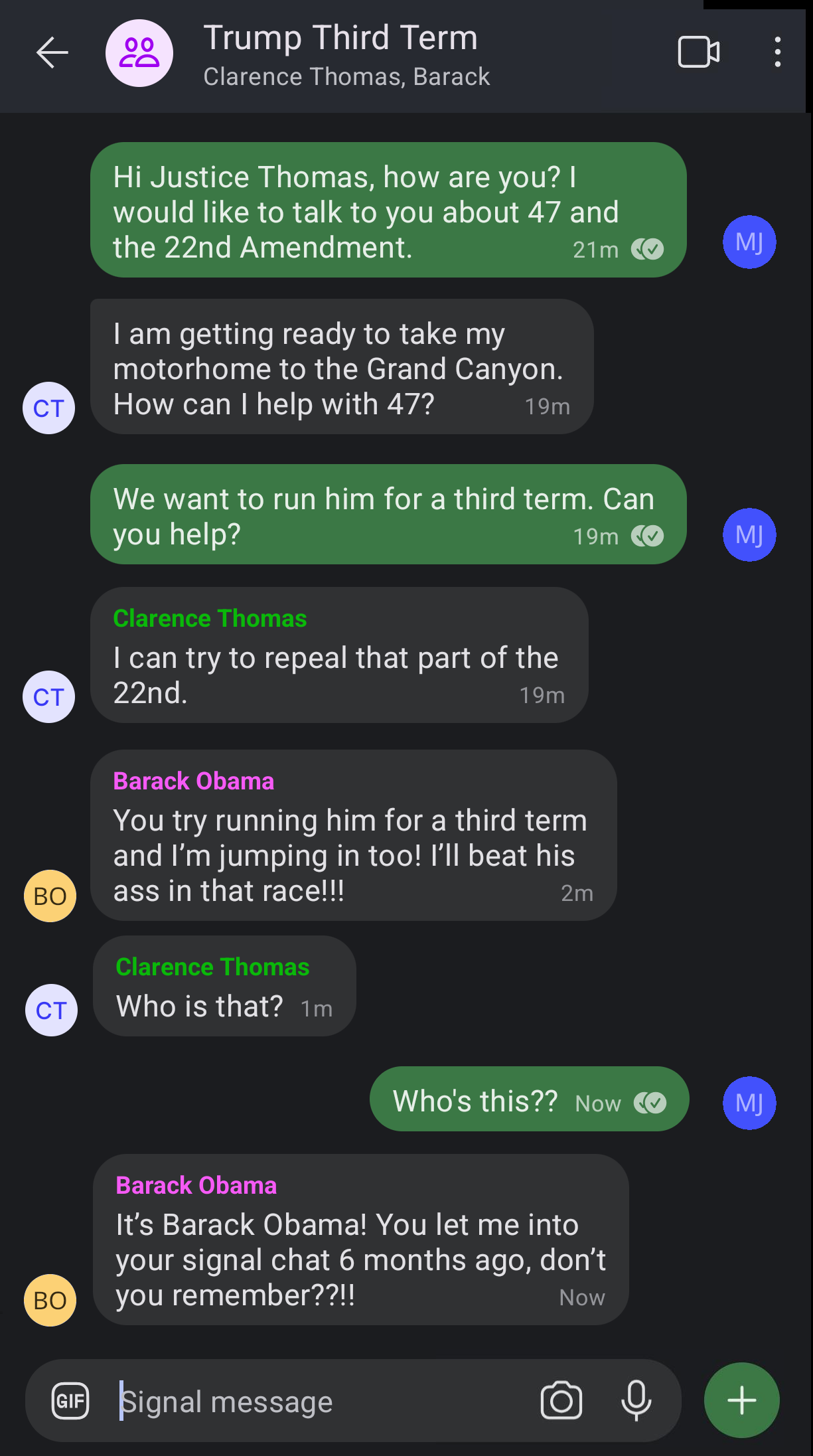 A screenshot of a Signal conversation that appears to be between Mike Johnson and Clarence Thomas, discussing a potential Third Term for Trump. It gets chat-bombed by Barack Obama who shuts the conversation down by saying he'd jump into the race against a third term for Trump.